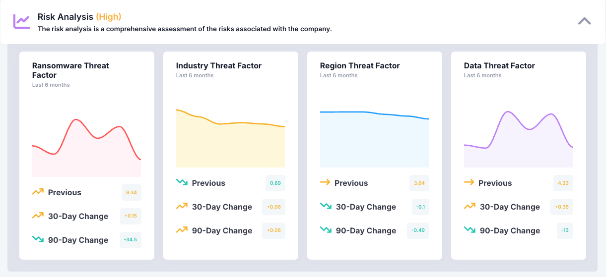 The Risk Analysis section breaks down the components that contribute to the overall Threat Factor, giving visibility into why a company is considered high or low risk.