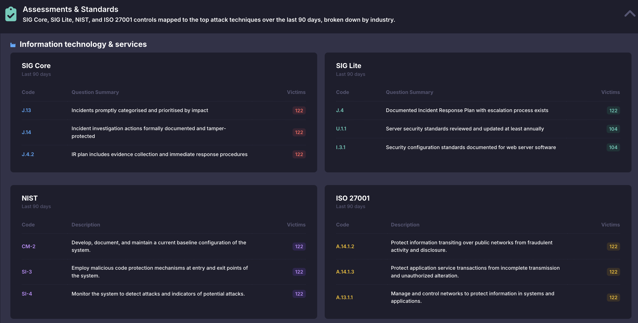 This section bridges real-world threat activity with security and compliance frameworks, helping you translate attacker behavior into actionable assessment priorities.